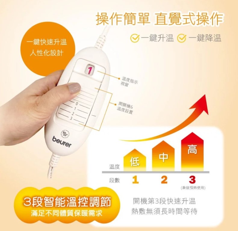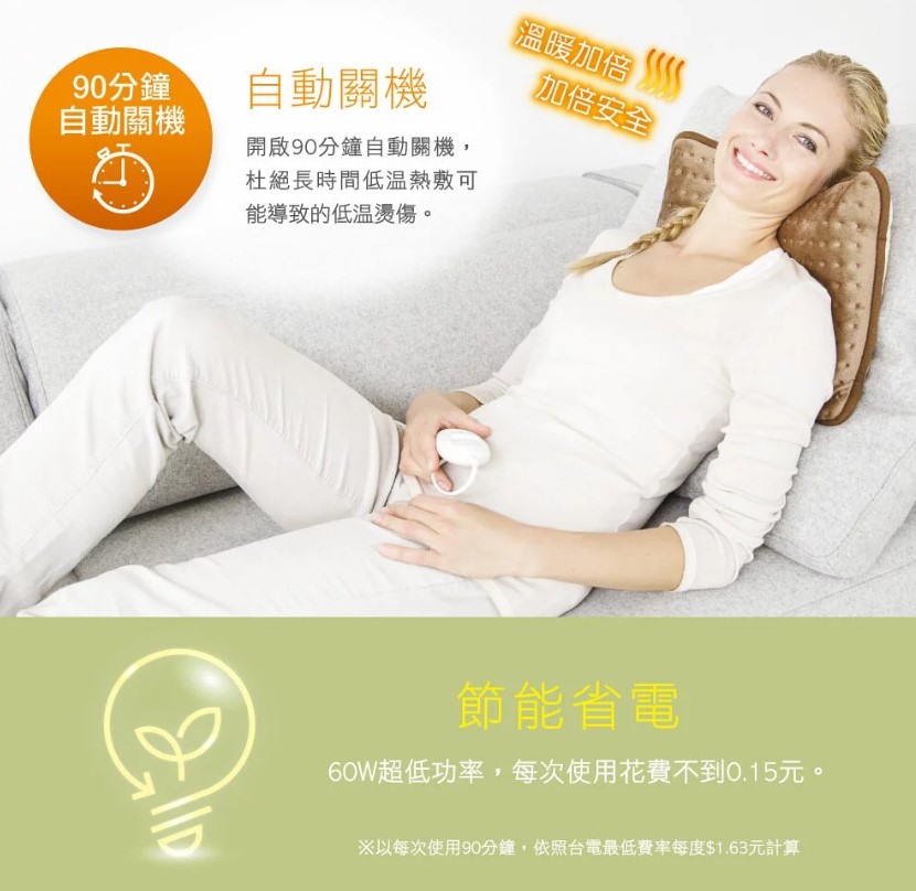 - 創新電源線系統:可拆式電源線,熱敷墊也可單獨機器洗滌